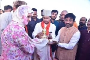 महाकुंभ आगमन पर उत्तर प्रदेश सरकार के औद्योगिक विकास मंत्री नंद गोपाल गुप्ता नंदी ने केंद्रीय मंत्री ज्योतिरादित्य सिंधिया को कुंभ कलश भेंट कर स्वागत किया।