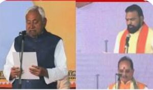 पटना के गांधी मैदान में आज सुबह से सियासी गहमागहमी नीतीश कुमार ने रिकॉर्ड दसवीं बार बिहार के मुख्यमंत्री पद की शपथ लेकर एक नया इतिहास लिख दिया। शपथ मंच पर उनके साथ सम्राट चौधरी और विजय कुमार सिन्हा भी मौजूद रहे, जिन्होंने बारी-बारी से मंत्री पद की शपथ ली।