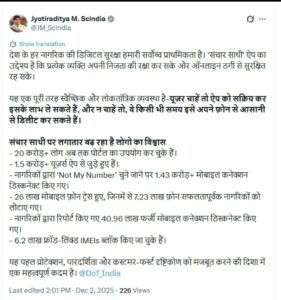 उन्होंने ऐप की सफलता को लेकर आंकड़े गिनाए. सिंधिया ने लिखा कि 20 करोड़ से ज्यादा लोग अब तक पोर्टल का उपयोग कर चुके हैं और 1.5 करोड़ से ज्यादा यूजर्स ऐप से जुड़े हुए हैं. ऐप में नागरिकों द्वारा ‘Not My Number’ विकल्प चुने जाने पर 1.43 करोड़ से ज्यादा मोबाइल कनेक्शन डिस्कनेक्ट किए गए.